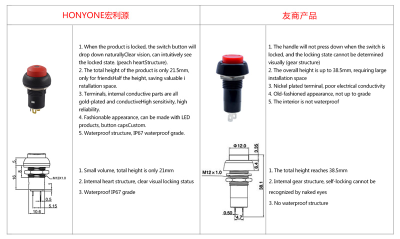 Since the launch of PB22 series in 2017, HONYONE company has constantly improved the product structure and d the product appearance according to the needs of market customers. The pb22-h.pb22-r series just launched by the company greatly enriched the category of this switch series. In order to better explain the characteristics of PB22 series products, we specially take the similar products of youshang for some comparison.