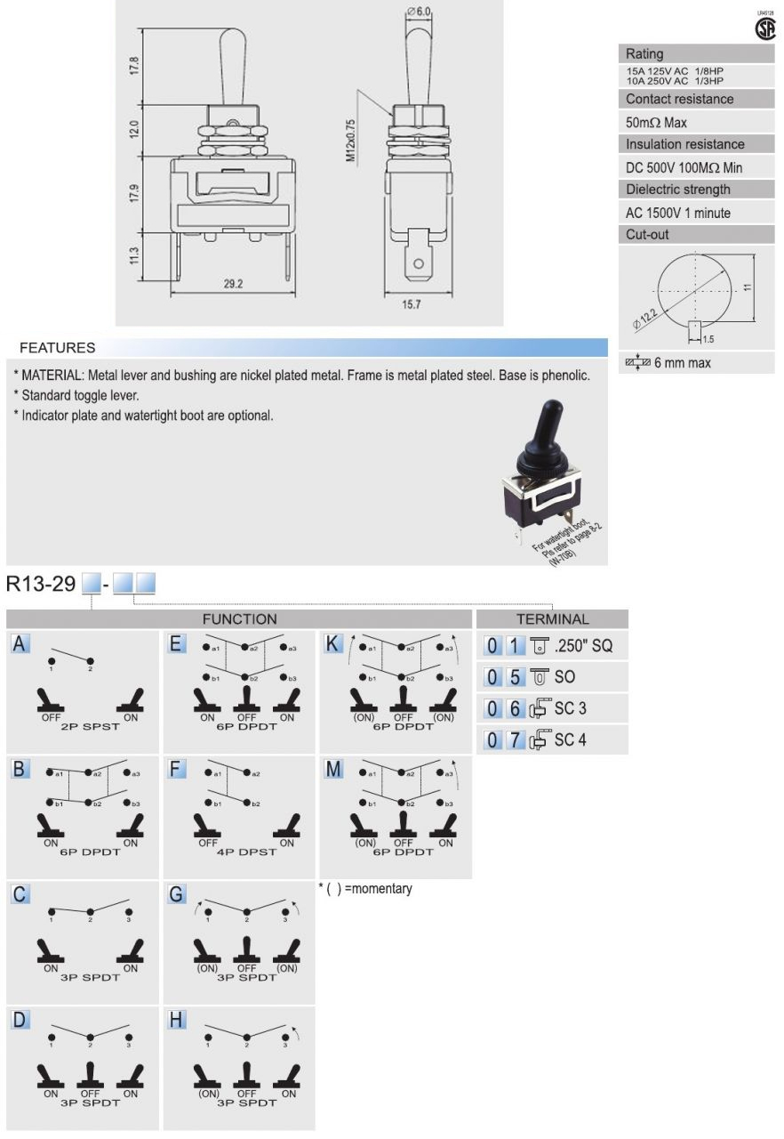Rating 15A 125V AC 1/8HP 10A 250V AC 1/3HP Contact resistance 50mΩ Max Insulation resistance DC 500V 100MΩ Min Dielectric strength AC 1500V 1 minute