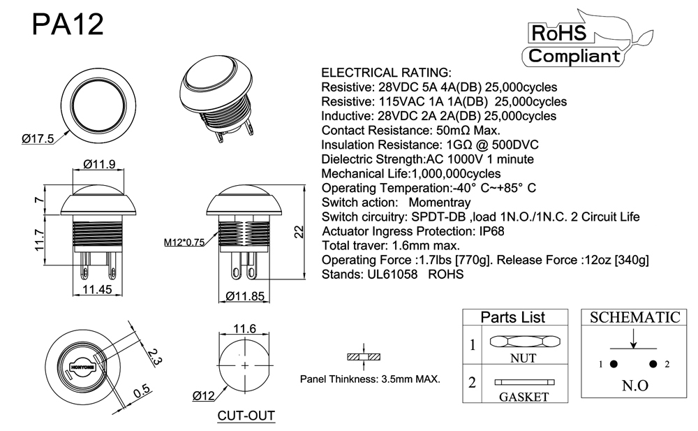 Resistive: 115VAC,60Hz 3A 1A(DB)25,000cycles