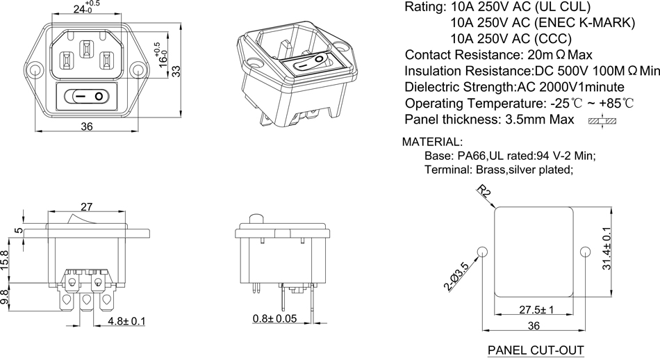 Rating: 10A 250V AC(UL CUL)