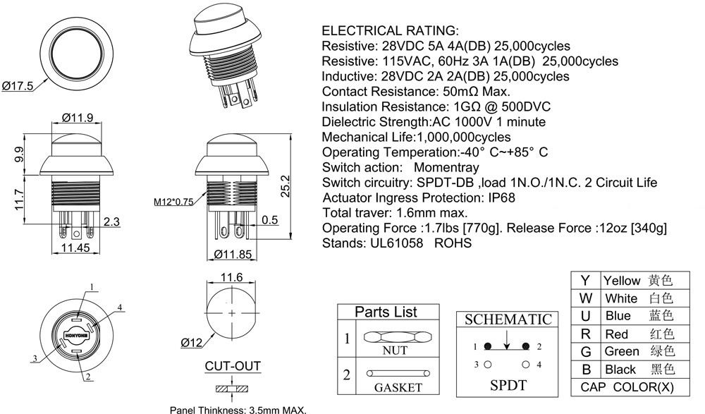 Resistive: 115VAC,60Hz 3A 1A(DB)25,000cycles